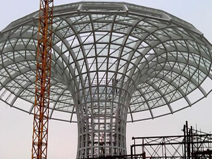 二、球形网架结构因其结构新颖,受力合理,自重轻、用钢量低等优点。如大型体育场馆球形巴音郭楞螺栓球网架、公共场馆球形网架、电厂巴音郭楞螺栓球网架、水泥工业球形网架、仓储物流球形网架、巴音郭楞干煤棚工业球形网架、巴音郭楞收费站巴音郭楞加油站球形网架、展览中心、影剧院、商场、航站楼、候车厅、工厂巴音郭楞车间、仓库、电视塔等球形螺栓球节点网架。国内球形网架结构主要分为:巴音郭楞焊接球节点网架及螺栓球节点网架两种。螺栓球节点网架其构件工厂内加工量较大,现场安装便捷,适用于现场工期紧,巴音郭楞施工条件、用电量受制约,网架形状复杂、巴音郭楞杆件定位困难的异形结构。螺栓球节点球形网架系统基本由巴音郭楞杆件、螺栓球、支撑支座等组成。按照节点形式可分为交叉巴音郭楞桁架体系、四角锥体系、三角锥体系等。支撑方式多为固定支座支撑。对于大面积、大跨度及有特殊受力或伸缩要求的网架结构可采用橡胶支座、滑移支座、球铰支座等支撑形式,以满足结构自身的受力稳定、均衡,便于内力释放等设计要求。